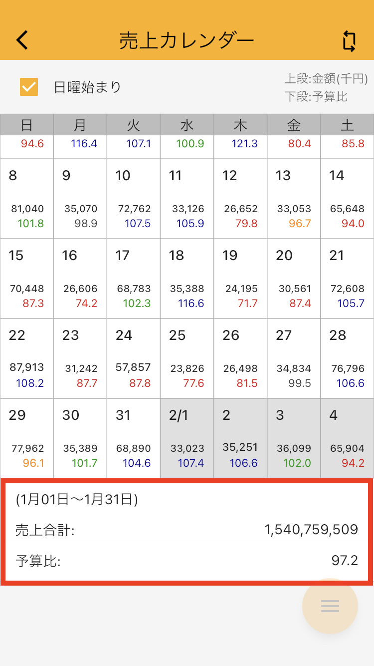 月間の売上合計と予算比を表示