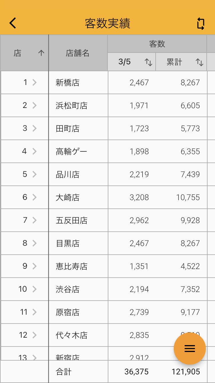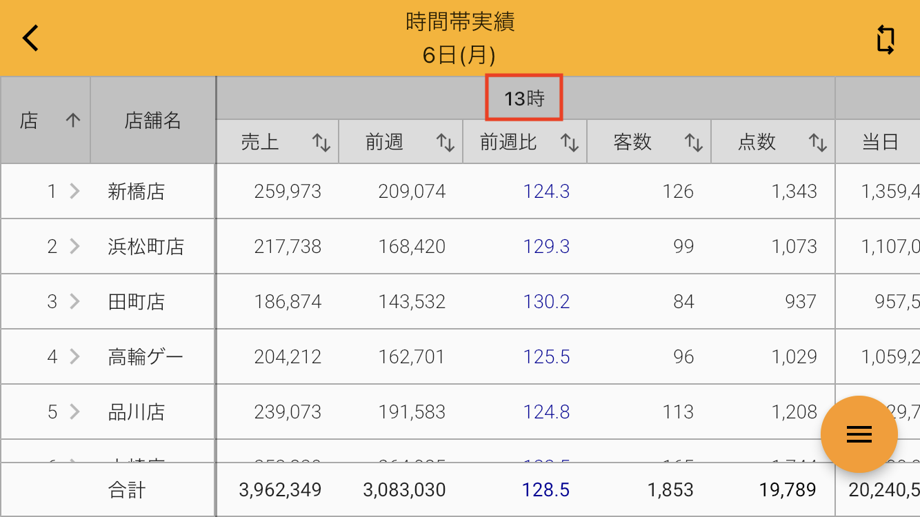 下記の画像では、13:00~13:59を「13時」の売上実績として表示しています。 この時間帯の売上実績を「14時」に変更することが可能です。 この設定をご希望される方は、弊社担当者へお申しつけください。